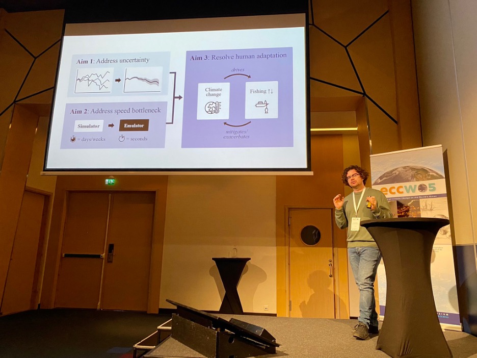 A busy week lay ahead. FishMIP members organized several sessions during the conference, each with their own purpose and venue. FishMIP convened an all-day session on the Advances in coupling regional climate and social-ecological models to improve climate-ready ecosystem management, which highlighted current approaches and identified critical gaps for coupling climate models to regional social-ecological systems. Ryan Heneghan, FishMIP modeller (ZOOMSS) and keynote speaker for this session, presented his thoughts on FishMIP projections, uncertainties, grand challenges, and solutions to make climate change model simulations more equitable. Other session speakers, presented on modeling efforts that integrate climate impacts across spatial and temporal scales, and emphasized approaches to incorporate statistically or dynamically downscaled climate projections into single species, food web, and social-ecological projections. As part of this session, research posters were displayed during an evening poster session, that showed some of the latest, applied science using global FishMIP projections.